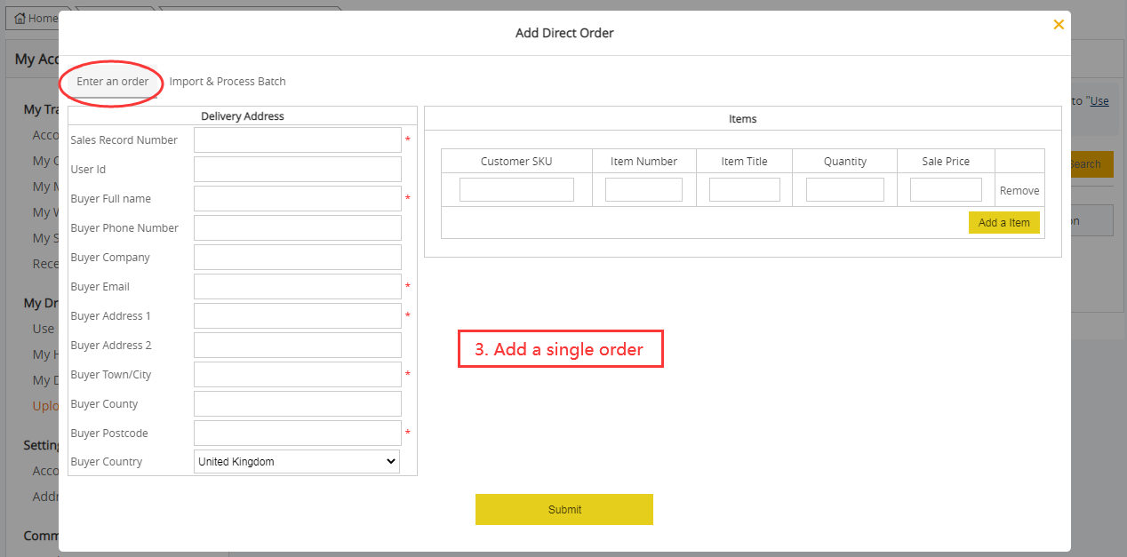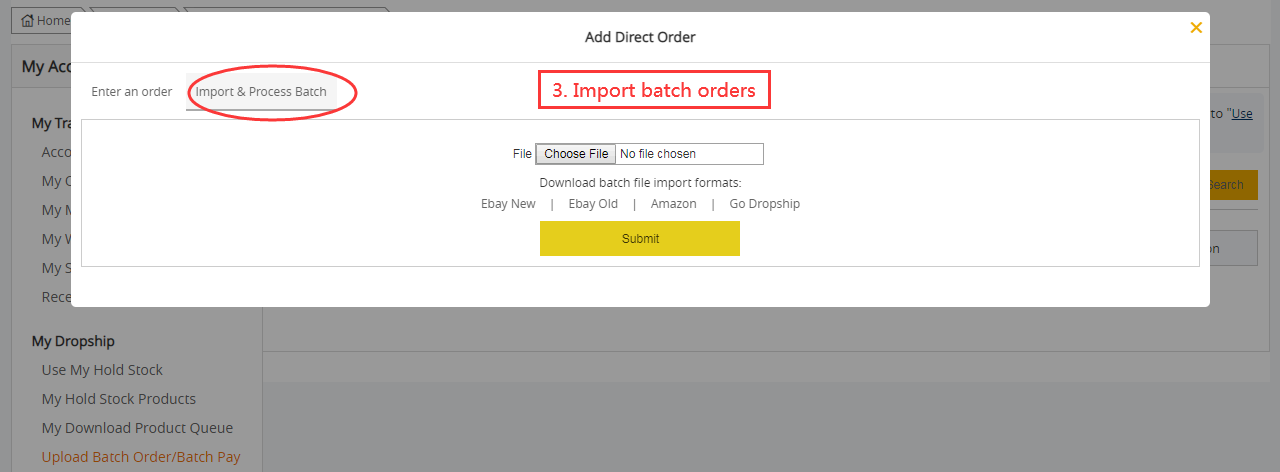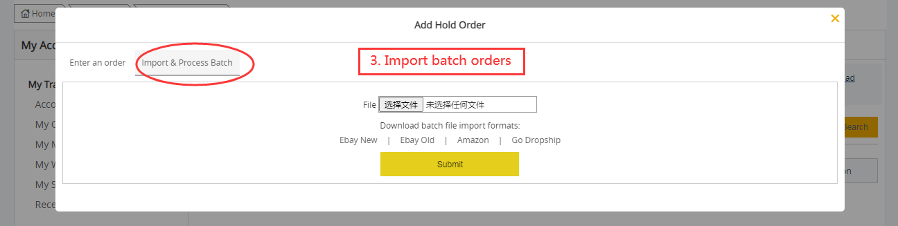 3. Add a single order or Import batch orders. You could click "Enter an order" to add your orders one by one; or click "Import & Process Batch" to import your batch orders as a file, just download one of file import format templates, and then copy your order info into the file and submit.