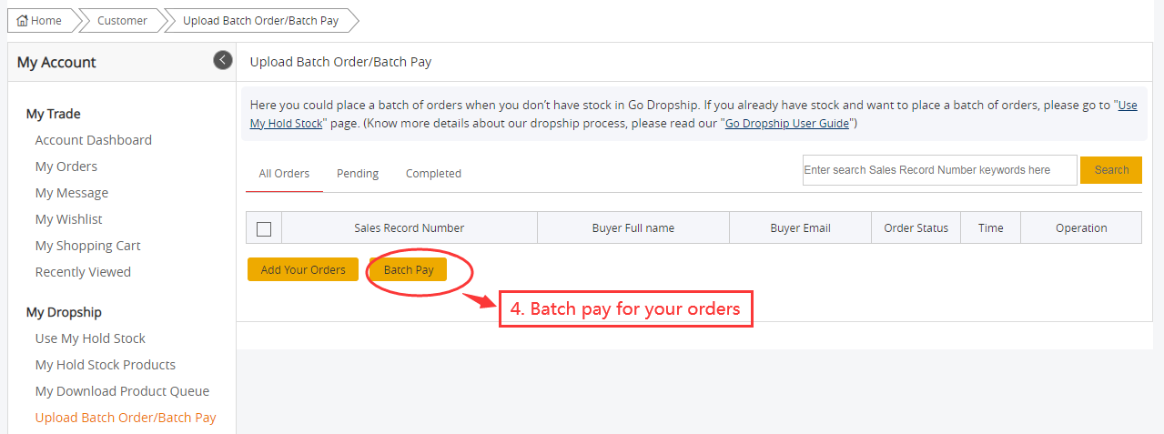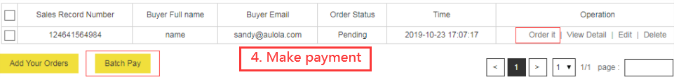 4. Batch pay for your orders. After you upload your orders, you could Batch Pay: to pay all the selected orders together.