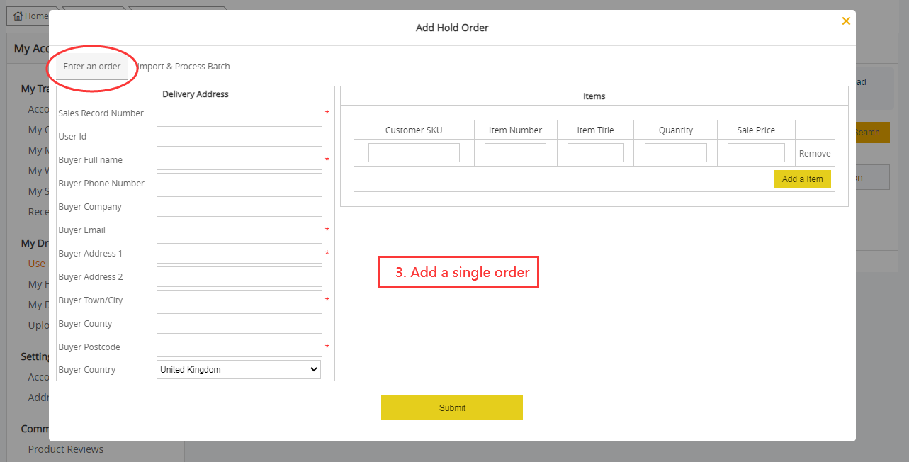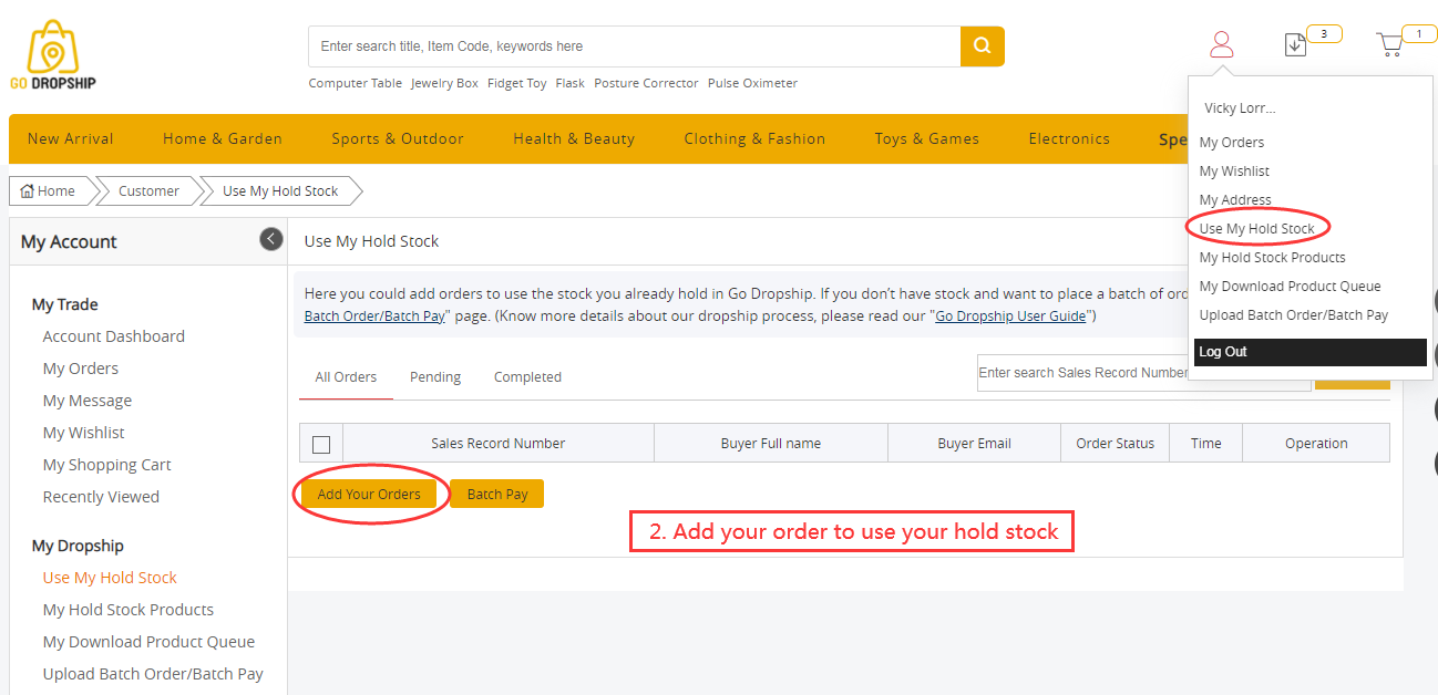 2. Add your order to use your hold stock. Go to "Use My Hold Stock" page, click "Add Your Orders".